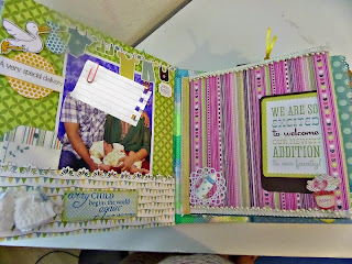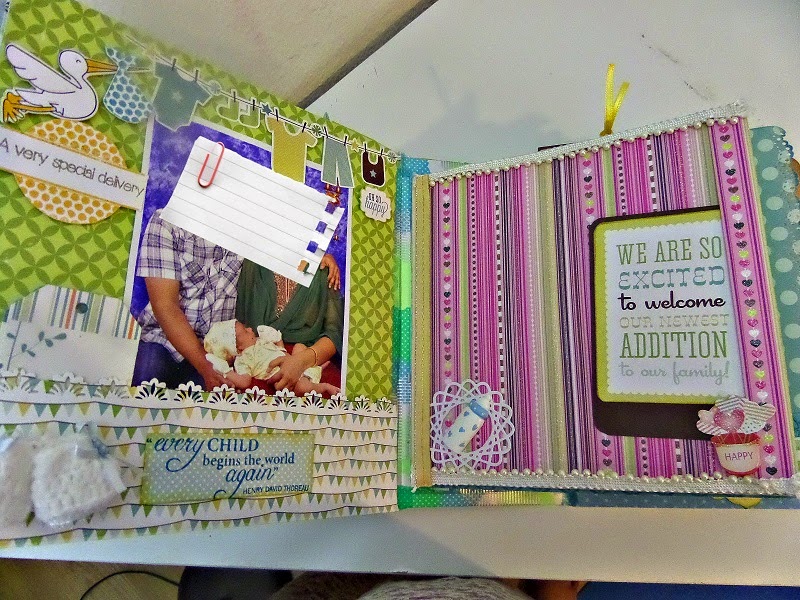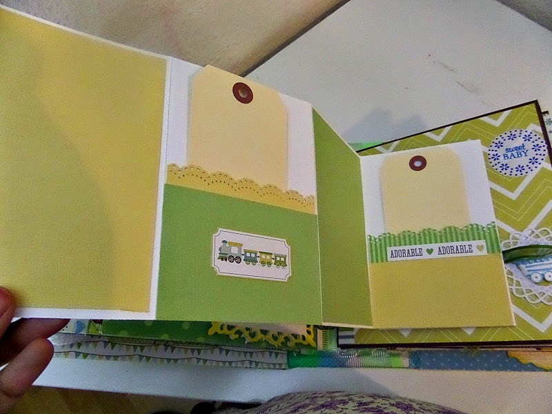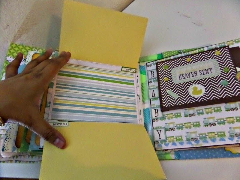• This page on left hand side has a fold which is made with 3 envelopes. The first baby steps photos can be put with the pockets of the envelops holding tags.