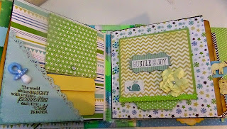 • The page on the right hand side has a photobox which holds 12 photos and 10 tags(distressed) with a brad. Each tag is gold embossed with baby sentiments.